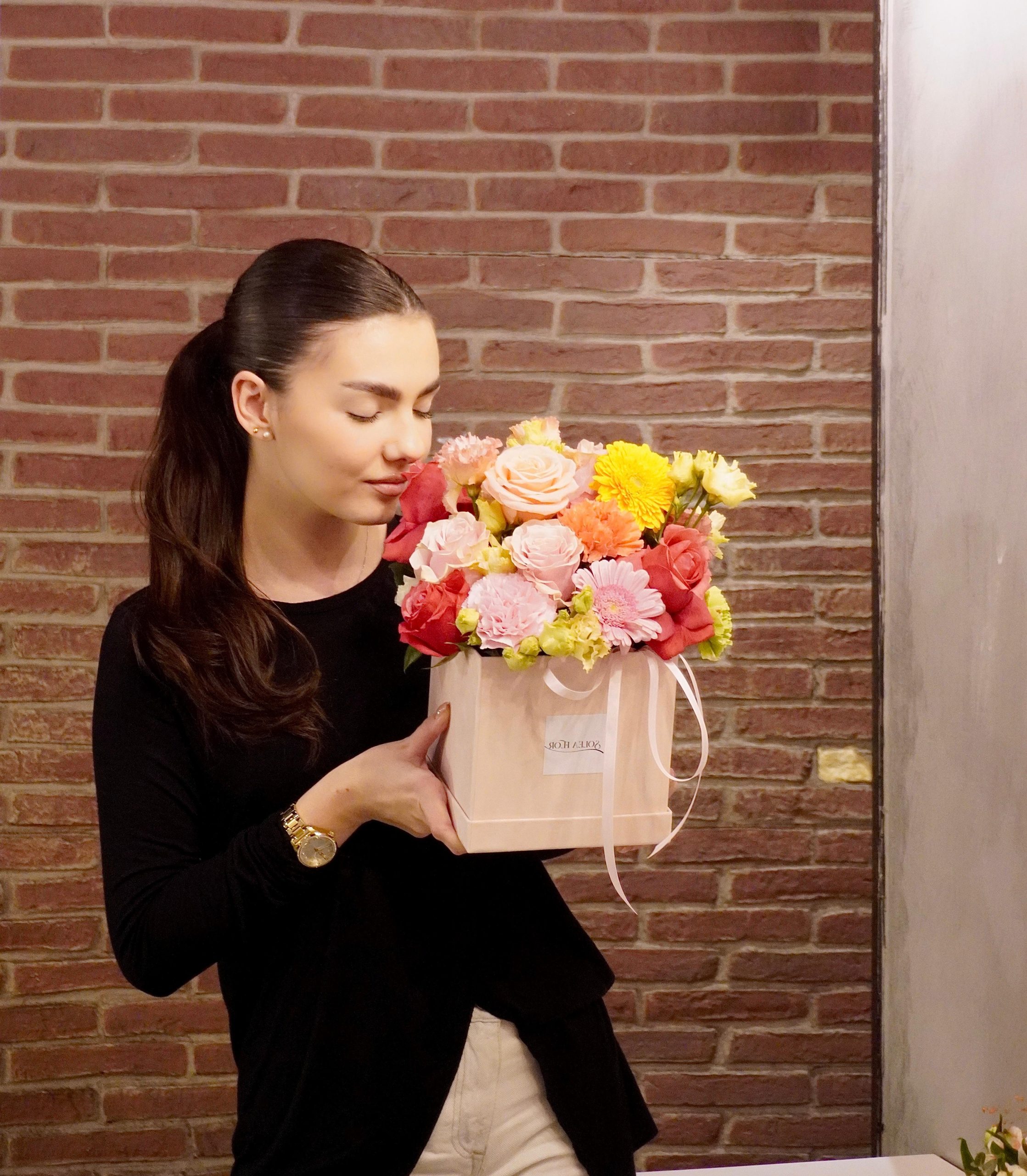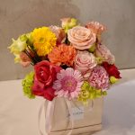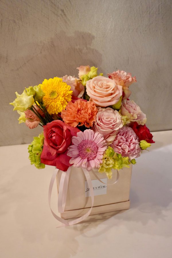 Aranjament floral în cutie bej, cu o combinație veselă de nuanțe pastel și accente calde: trandafiri piersică și roz pudrat, gerbera galbenă și roz, garoafe corai și roz, lisianthus și flori de sezon în tonuri verzi și crem. Compoziția este aerisită și luminoasă, potrivită pentru aniversări, mulțumiri sau un cadou delicat de zi cu zi.