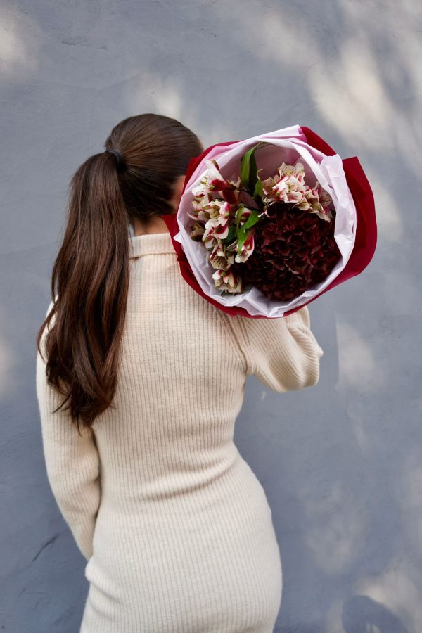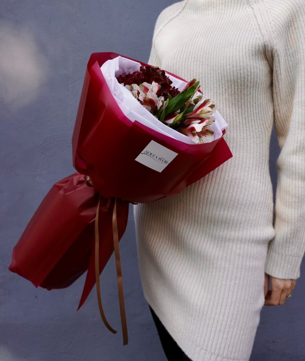 Un buchet rafinat, cu un design modern și intens, creat pentru a transmite eleganță și emoție în fiecare detaliu. Ambalat în hârtie burgundy lucioasă și legat cu o panglică satinată, acest aranjament floral este alegerea perfectă pentru momentele în care vrei să impresionezi.