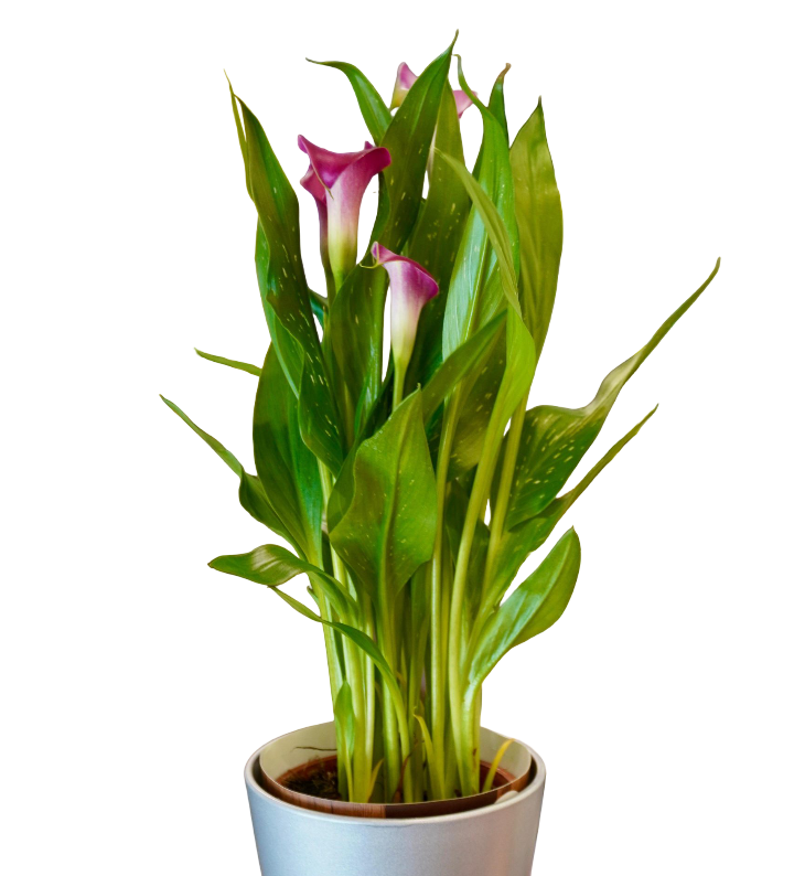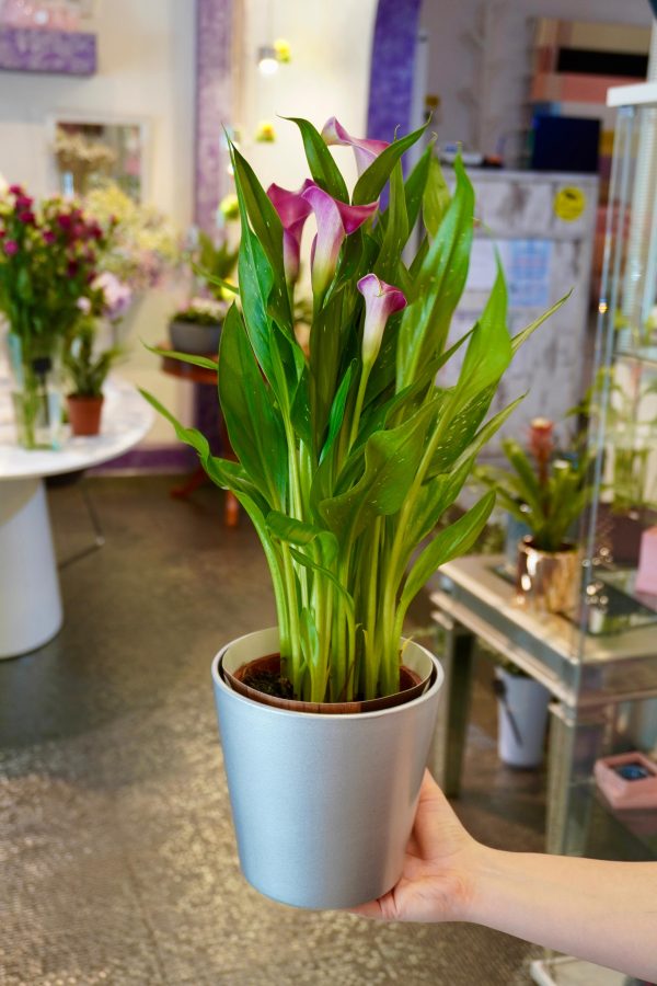 Calla Floare Regală este o alegere sofisticată și elegantă, potrivită pentru a înfrumuseța orice spațiu cu rafinament. Floarea de Calla, cu petalele sale grațioase în nuanțe intense de mov și verdele vibrant al frunzelor, transmite noblețe și delicatețe în același timp. Este o plantă ce atrage atenția prin simplitatea sa elegantă și prin aerul luxuriant pe care îl emană.
