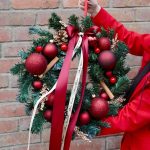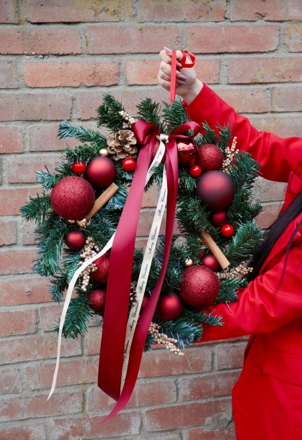 Coroniță de Crăciun bogată și elegantă, realizată pe bază de brad natural, pentru un aspect de iarnă autentică. Decorul în tonuri intense de roșu — globuri mate și lucioase, bobițe festive și fundă amplă din panglică satinată — oferă un aer clasic, cald și foarte spectaculos la intrare. Este o piesă statement, care îmbracă frumos ușa sau peretele și aduce instant atmosfera de sărbătoare în orice spațiu. Lucrată manual, cu atenție la volum, echilibru și rezistență, ca să se păstreze superbă pe tot parcursul sezonului.