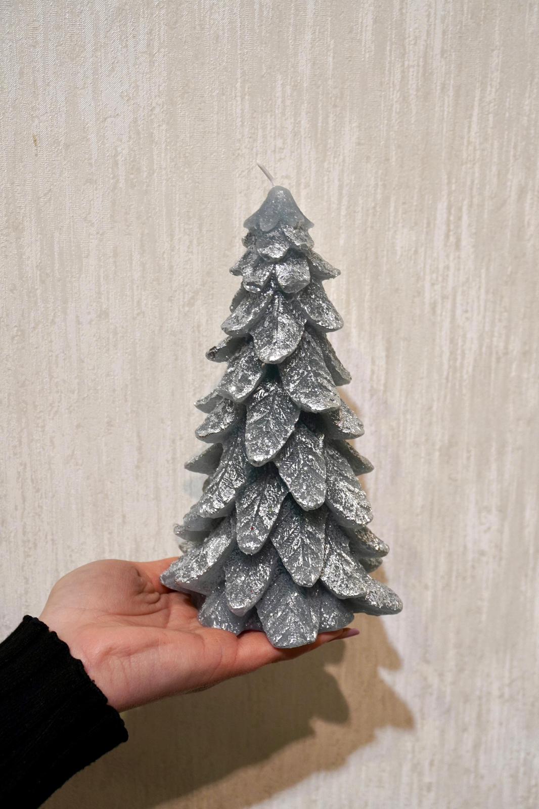 Lumânare decorativă în formă de brad, cu finisaj argintiu strălucitor, inspirată de farmecul iernilor elegante și al sărbătorilor moderne. Textura detaliată a ramurilor și reflexiile discrete oferă un efect vizual rafinat, potrivit atât pentru decoruri minimaliste, cât și pentru cele festive. Poate fi așezată pe masă, pe o comodă sau integrată într-un aranjament de Crăciun, aducând o notă de lumină și stil în orice încăpere. Ideală și ca mic cadou de sezon.