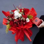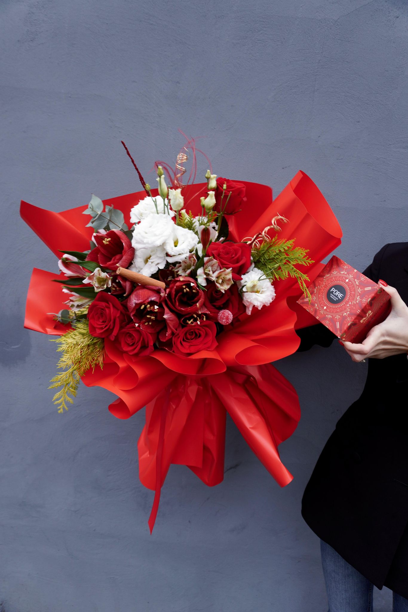 Pachet complet pentru o surpriză memorabilă: un buchet opulent în tonuri de roșu intens și alb, cu trandafiri catifelați, lisianthus alb și accente decorative elegante, ambalat spectaculos în hârtie roșie. Alături, o cutie de bomboane fine și baloane cu heliu care ridică momentul la nivel de sărbătoare. Ideal pentru aniversări, declarații sau orice ocazie care merită un „wow” instant.