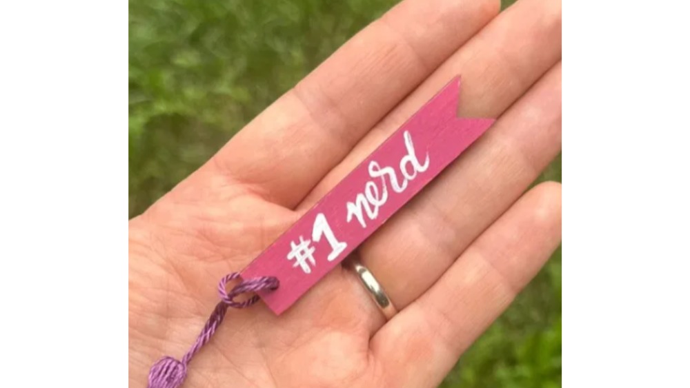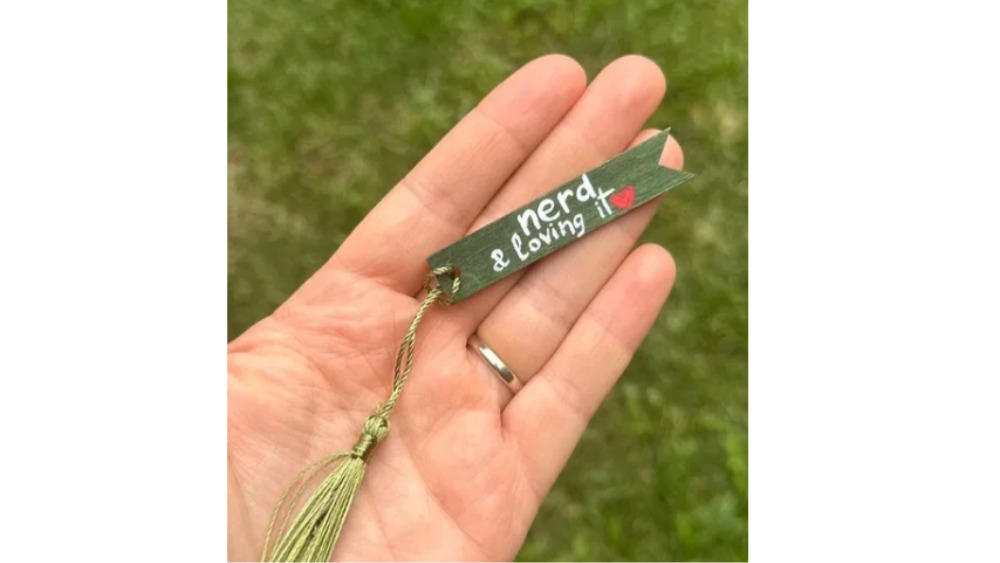 Un accesoriu perfect pentru pasionații de lectură! Semnul de carte cu mesajul amuzant „nerd & loving it ❤️” este realizat manual, cu atenție la detalii, și vine cu un ciucure elegant, care adaugă un plus de stil fiecărei pagini.