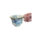 Formă clasică, cu toartă curbată și detalii decorative aurii.