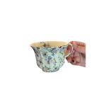 Porțelan de calitate, cu imprimeu floral în nuanțe de roz, galben și verde.
