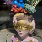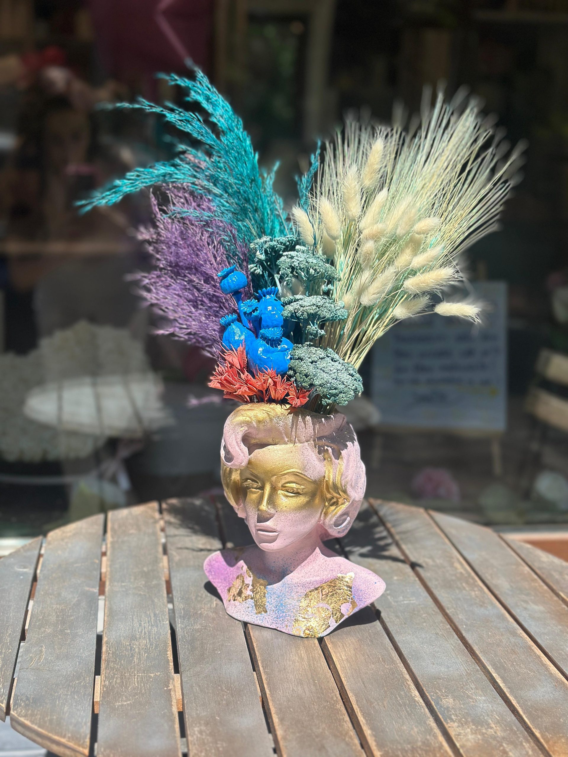 Adaugă un accent artistic și extravagant în decorul tău cu această statuetă decorativă inspirată de Marilyn Monroe, pictată manual în nuanțe aurii, roz pastel și mov cosmic, completată de un aranjament vibrant din flori și plante uscate. O combinație spectaculoasă între glamour-ul vintage și naturalețea boho modernă, perfectă pentru spații creative, showroomuri, cafenele sau cadouri neconvenționale.